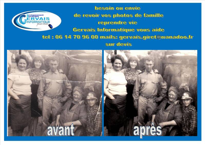 GERVAIS INFORMATIQUE; et à votre service pour tous vos problèmes de nettoyage informatiques ; recherche de virus ; nettoyage de vos logiciels ; optimisation ; accélération de votre PC ; sauvegarde de vos données ; récupération de vos données, mais aussi un service de création graphique : création de cartes de visite personnelle et professionnelle ; visuel d’entreprise ; faire part de: mariages ; anniversaire; baptême ; réunion de famille; mais aussi reportage photo ou vidéo de vos événements divers, mais encore de la création en 3D via imprimante 3D et encore beaucoup d’autres services