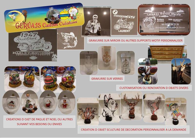 Service de création dans un bon nombre de disciplines création : (d image ; de décoration intérieure ; relookage de meuble ; gravure sur divers support et divers mode ; création d’objets pour toute occasion ou fête ; mariage ; anniversaire, etc. .....)